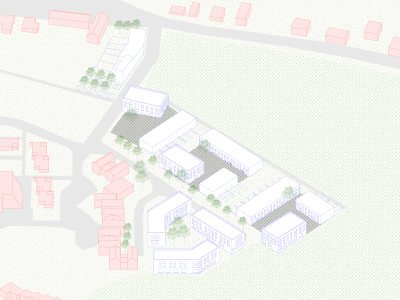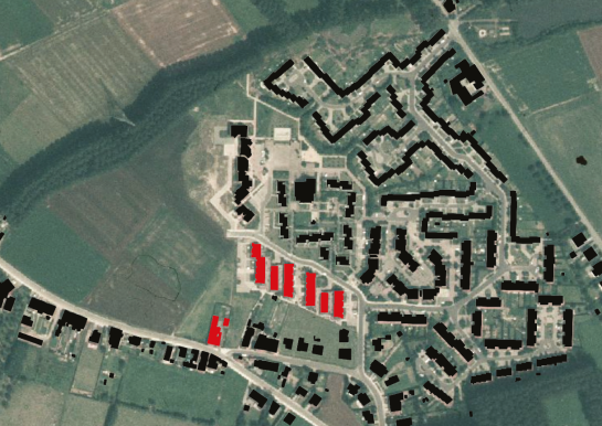 04. Wat wordt er gebouwd?De gebouwen in het blauw op de foto komen erbij. De lege vakjes stellen tuinen voor.