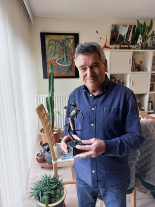 Ja, dat was in Brugge, bij mijn eerste tentoonstelling. Het was het beeld van een kleine vioolspeler. Ik heb nog een foto waar ik op sta met de cheque in de hand. Die eerste verkoop raakte me, want ik geloofde toen zelf niet in mijn kunnen. De tentoonstelling was er gekomen op initiatief van een kennis die een juwelierszaak had in Brugge. Hij zag dat ik mannetjes van koper had gemaakt en zei: “Ik stel u gratis mijn zaak ter beschikking voor een tentoonstelling.” Hij heeft zelfs voor affiches gezorgd. Het is dankzij hem dat ik mijn werkstukken ben beginnen verkopen. Hij geloofde er echt in. Later was er dan nog iemand uit Frankrijk die interesse had in mijn werk en zo heb ik verschillende tentoonstellingen gedaan in Frankrijk.